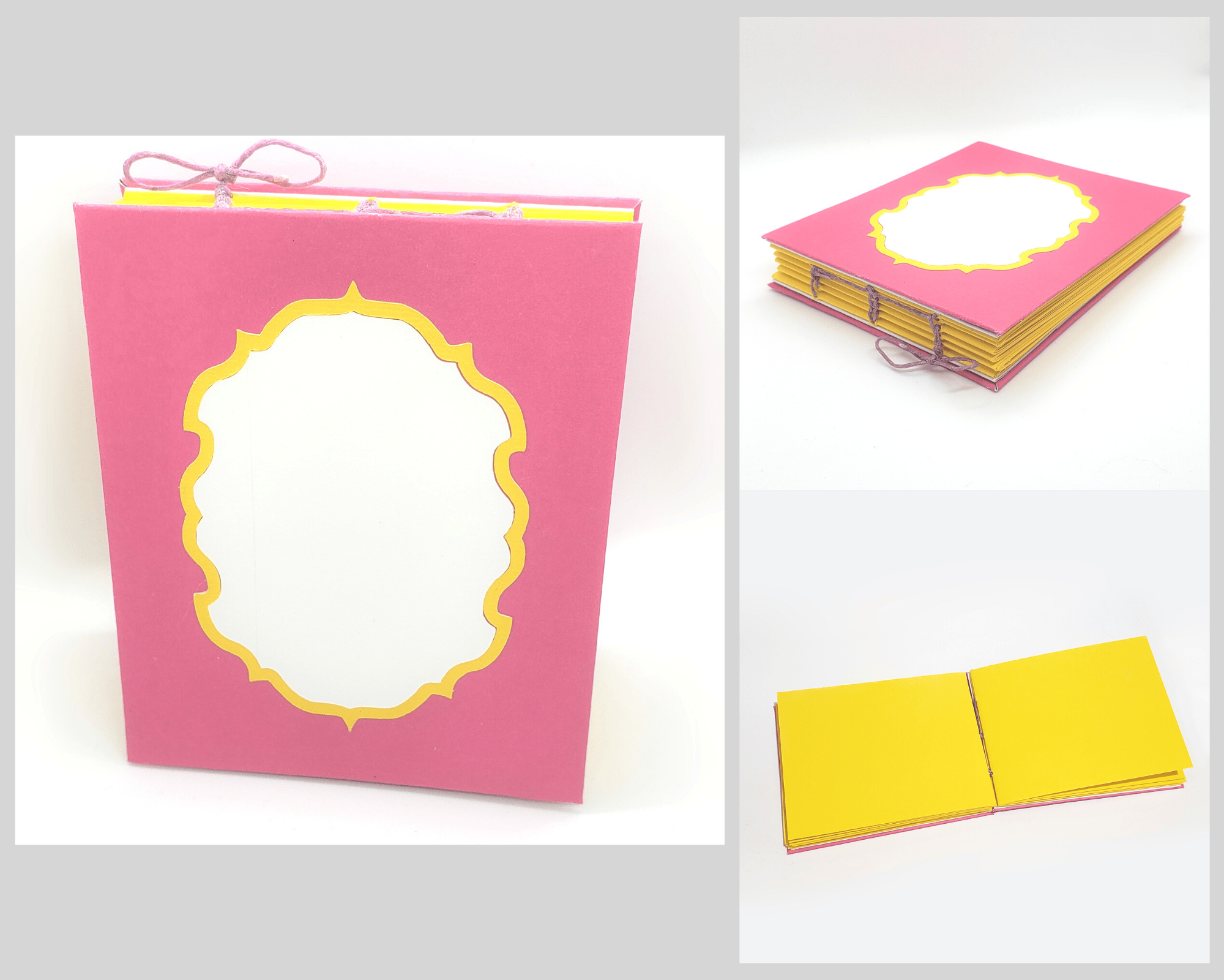 Handbound book with exposed spine and front cover decal. Able to lay open flat.